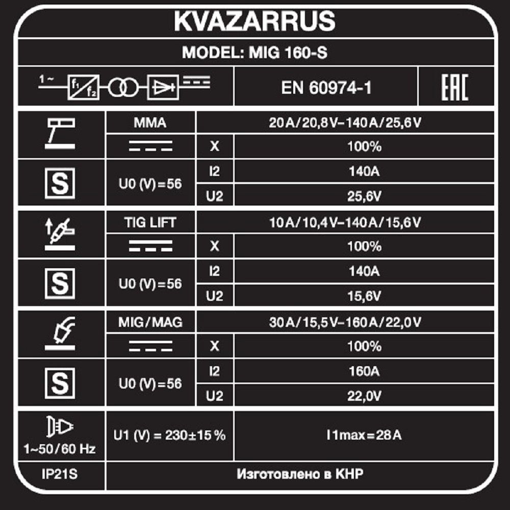 KVAZARRUS MIG 160 - S имеет синергетическую систему управления в режиме полуавтоматической сварки. Синергетическое управление дает возможность модифицировать все сварочные параметры, осуществляя регулировку лишь единственного параметра. Наличие синергетического режима управления позволяет легко и быстро настроить аппарат под любую задачу. В этом случае, имеются следующие преимущества: простота в настройке даже неквалифицированным персоналом, быстрая установка сварочных параметров, гарантированное получение качественного сварного соединения.