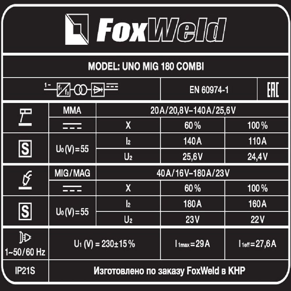 Сварочные инверторы MIG-MAG Fox Weld UNO MIG 180 COMBI: характеристики
