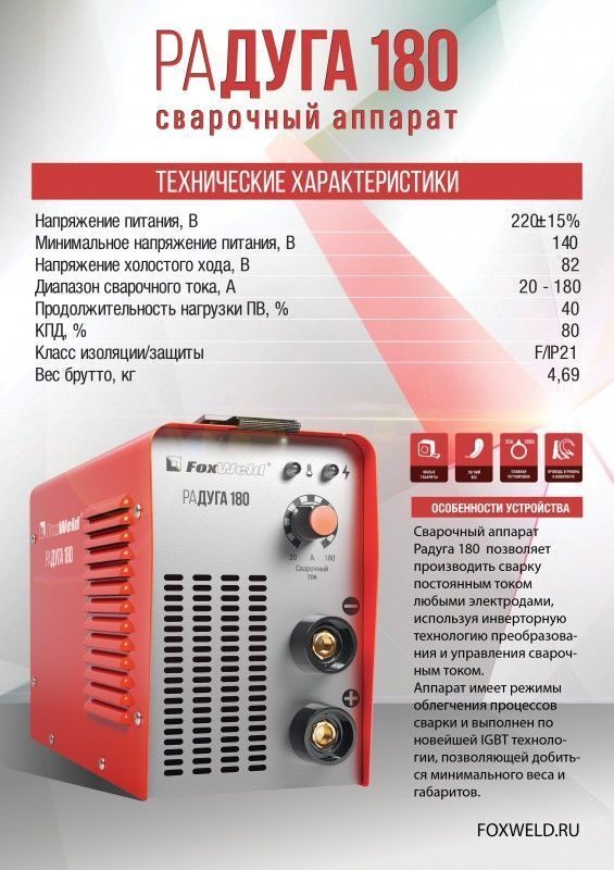 Сварочный инвертор MMA Fox Weld РАДУГА 180: характеристики